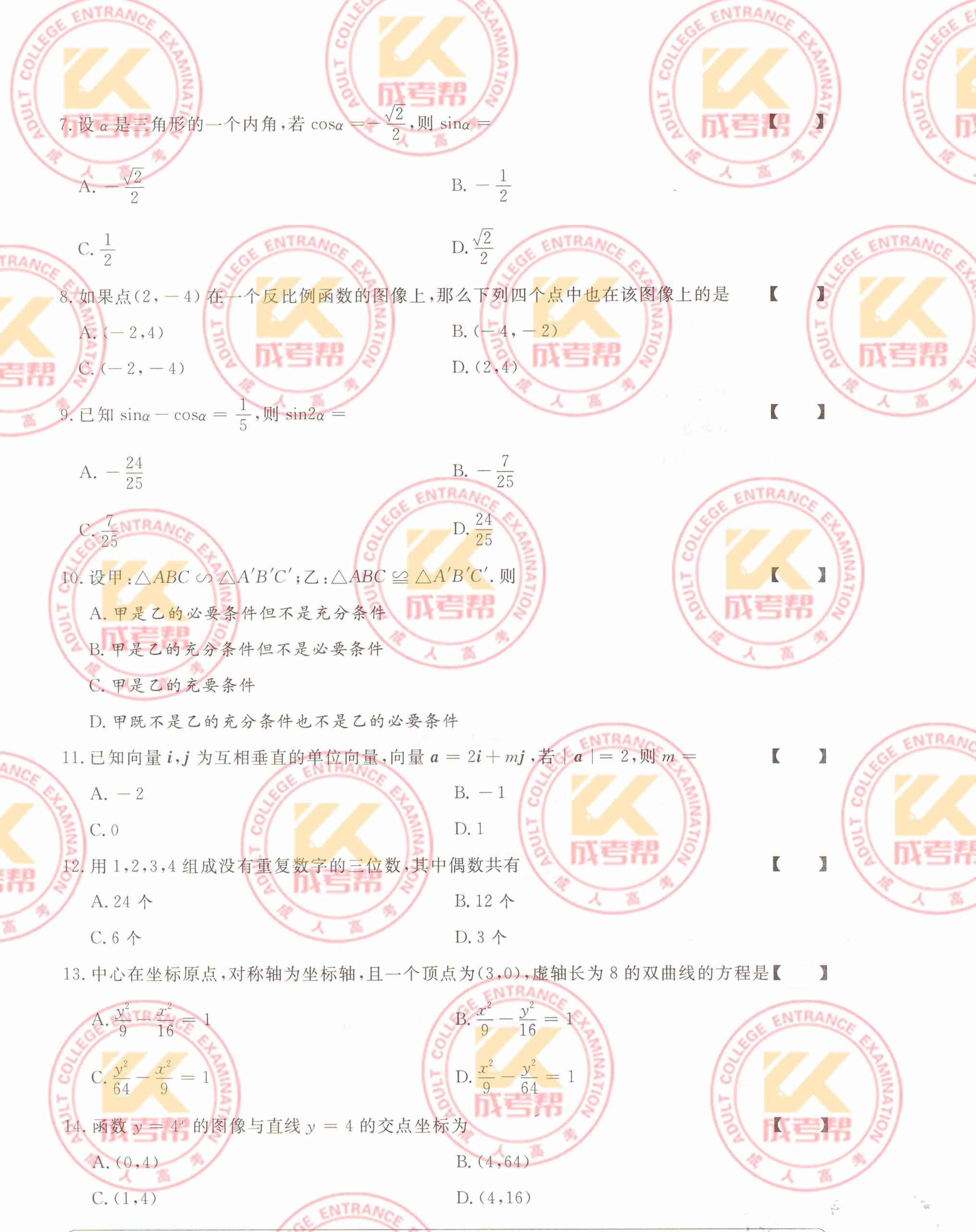2022年上海成人高考高起点数学(文)考试真题及答案